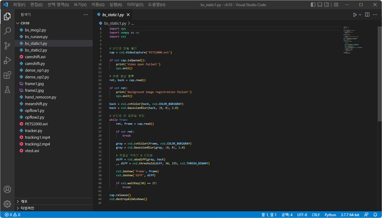 | [Open CV] 객체추척과 모션벡터 _ 배경차분 _ MOG 배경모델 (0) | 2022.06.28 |