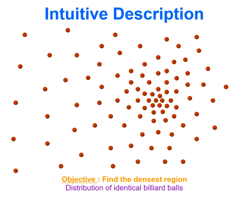 위 사진에서 빨간 점들이 데이터 분포라고 보고 위 데이터 중 가장 많은 데이터가 분포하는 위치를 찾고싶으면