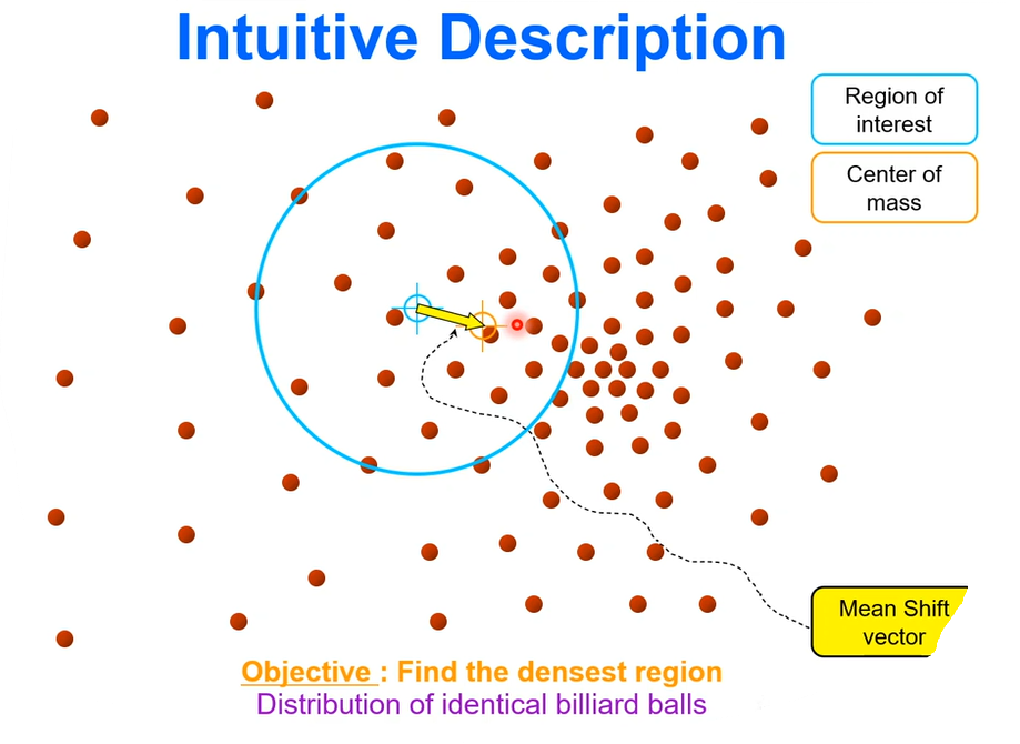 임의의 크기의 원을 그려서 원 내부에 들어있는 데이터들의 x좌표를 구해서 평균을 내고 y좌표를 구해서 평균을 낸다.