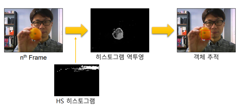RGB를 HSV로 변환해서 사용하는데 HS만 사용하고 V에 대한 값은 보지 않는다.V는 조명에 의한 값이기 때문에 컬러를 추적하기 위해서는 V를 빼고 추적해야 더 효율이 있다.