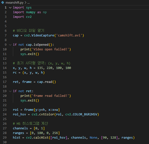 - 여기에 평균 이동 알고리즘을 적용하여 객체를 추적