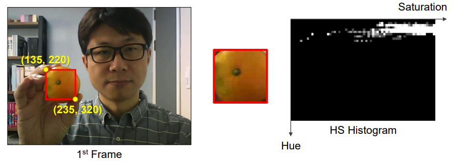 1) 추적할 객체 등록 - 첫 번째 프레임에서 추적할 객체의 위치를 지정 - HSV 색 공간에서 HS 히스토그램을 구함