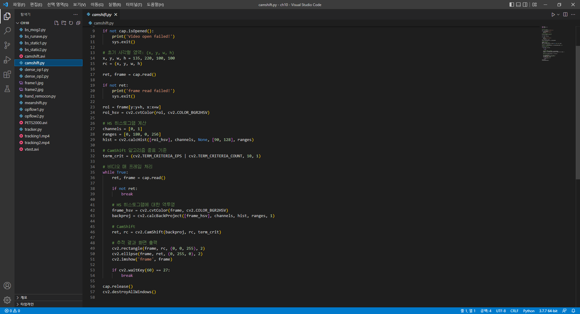 이상 MeanShift 알고리즘과 Cam Shift 알고리즘에 대해 설명이 끝났는데