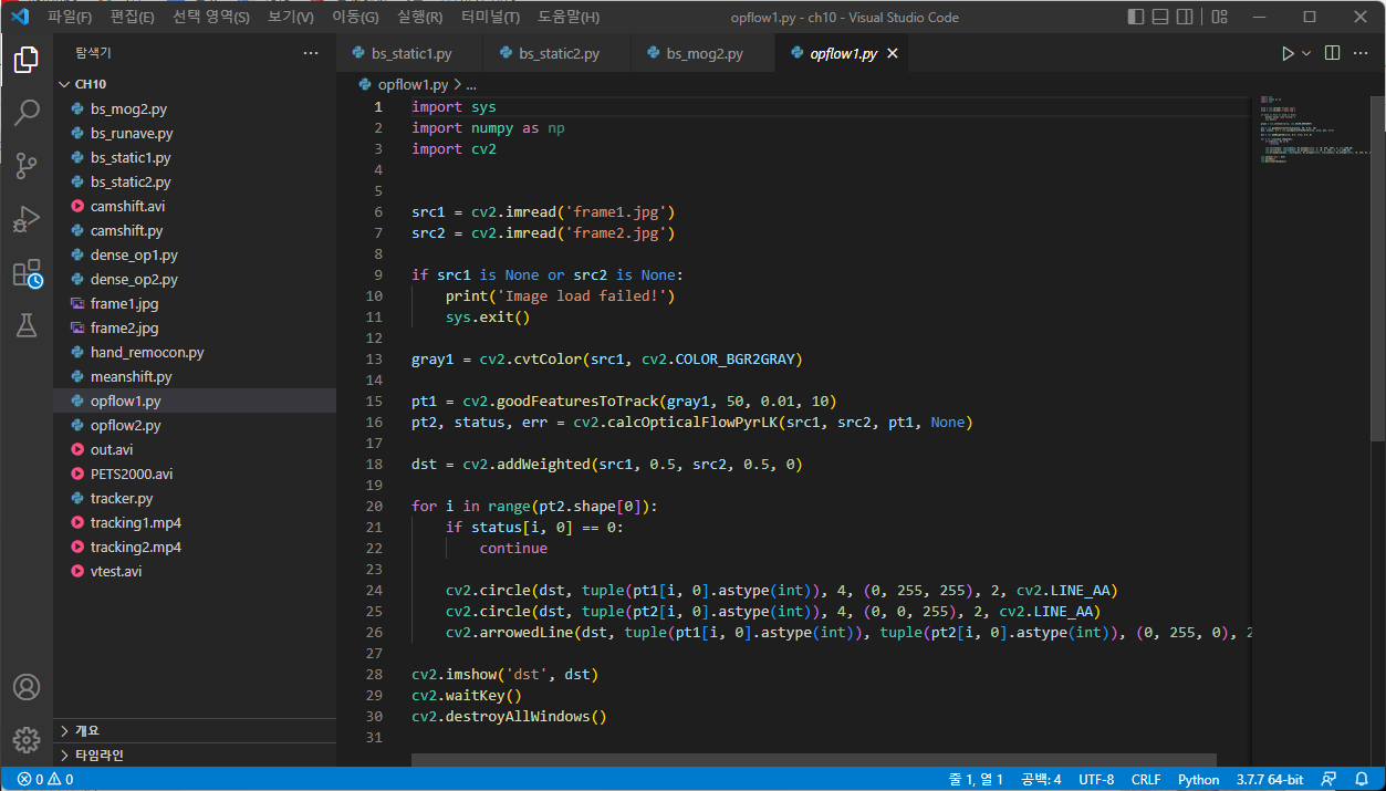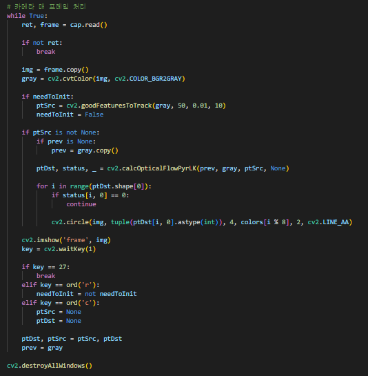 flgs=0: 연산 모드 (0: prevPts를 nextPts의 초기 값으로 사용, cv2.OPTFLOW_USE_INITAL_FLOW: nextPts의 값을 초기 값으로 사용, cv2.OPTFLOW_LK_GET_MIN_EIGENVALS: 오차를 최소 고유 값으로 계산)