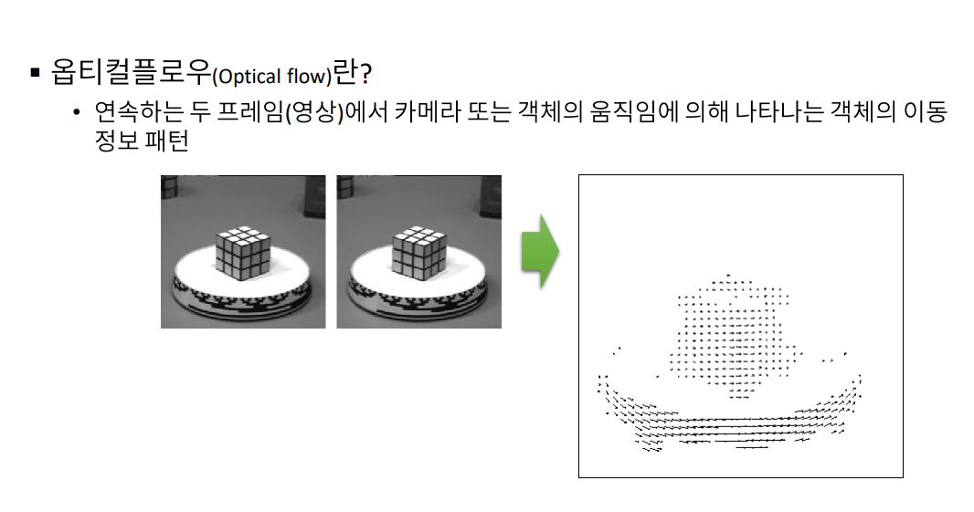 - 연속하는 두 프레임 ( 영상 ) 에서 카메라 또는 객체의 움직임에 의해 나타나는 객체의 이동 정보 패턴