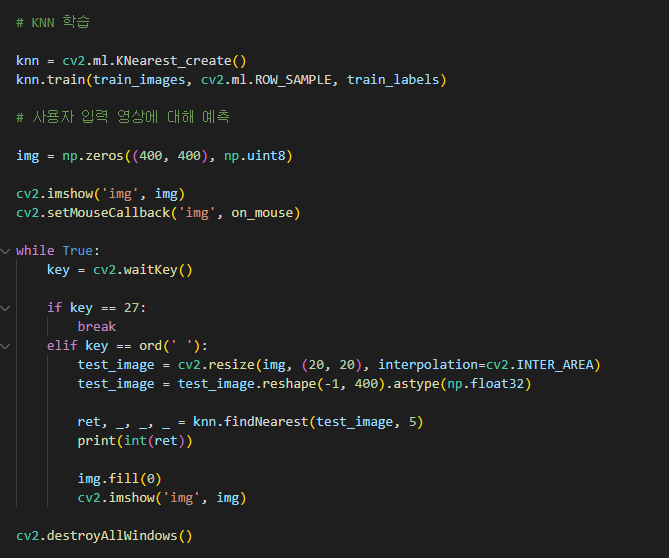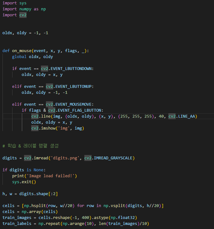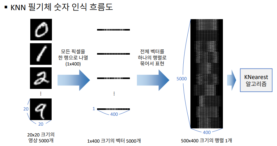 필기체 숫자 데이터는 OpenCV에서 제공하는 필기체숫자 파일이 있는데 이를 머신러닝으로