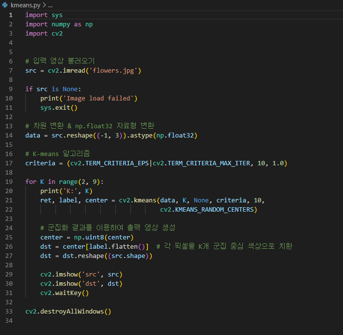 flags : 초기 중앙 설정 방법. cv2.KMEAS_RANDOM_CENTERS, cv2.KMEANS_PP_CENTERS, cv2.KMEANS_USE_INITIAL_LABELS 중 하나