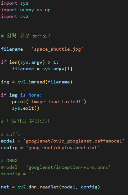 실행할때 파일이름을 옆에 작성하여 불러오면 바로 GoogLeNet을 실행할 수 있도록 하게 함이다.