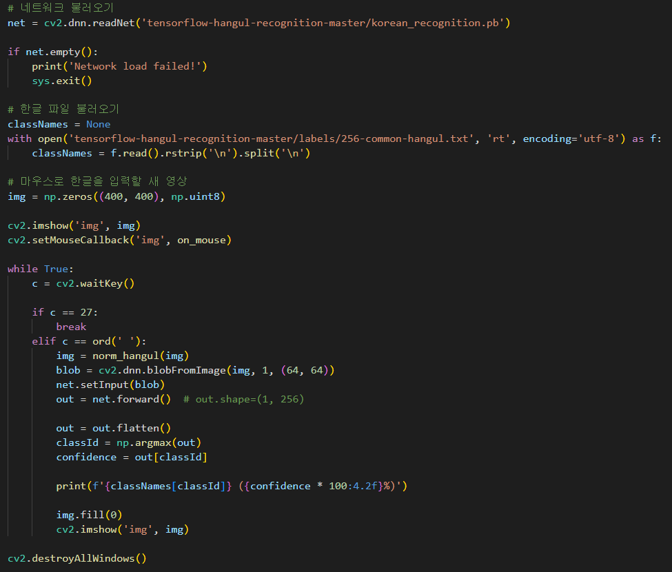 OpenCV 에서 저장된 모델을 이요하여 한글 인식을 수행하는 프로그램