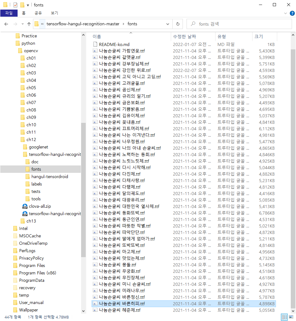설치된폴더 \ tensorflow-hangul-recognition-master \ fonts \ 폴더에 저장한다.