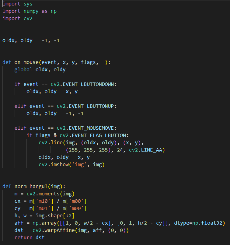 - 마우스로 한글 입력 후 인식