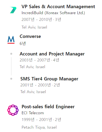 위와같이 IT 관련 최고의 군부대에서 좋은 경험을 가지고 나와 아래 이미지에 나온 것과 같이 통신업계인 ECI와 Comverse에서 10년이상의 근무를 한것으로 보입니다.