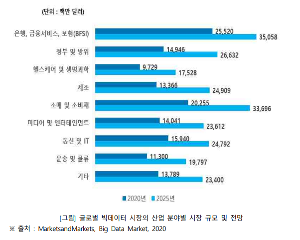 전 세계 빅데이터 시장은 산업 분야에 따라 은행·금융서비스·보험(BFSI), 정부 및 방위, 헬스케어 및 생명과학, 제조, 소매 및 소비재, 미디어 및 엔터테인먼트, 통신 및 IT, 운송 및 물류, 기타로 분류