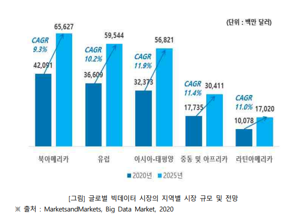 전세계 빅데이터 시장은 2020년 1,388억 8,600만 달러 ( 200조 1,347억 2,600만 원 ) 에서 연평균 성장률 10.6%로 증가하여 2025년에는 2,294억 2,300만 달러 ( 330조 5,985억 4,300만 원 )에 이를 것으로 전망된다고 합니다.