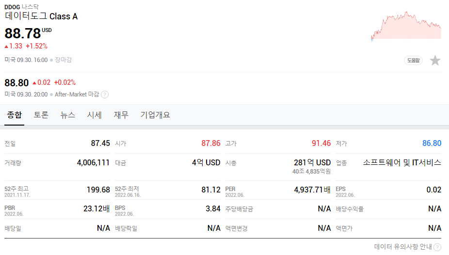 데이터독 ( DDOG ) 이외에는 아직 순이익이 흑자가 난 기업이 없는 것으로 보아