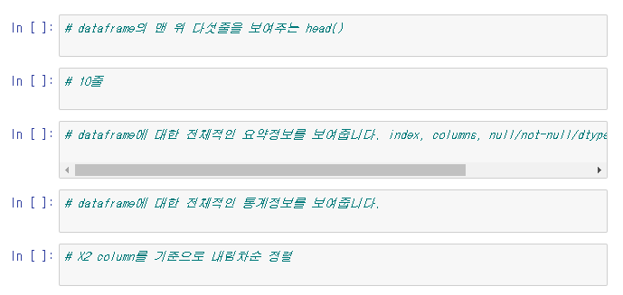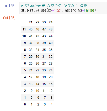 df.sort_values(by = "x1") 와같이 columns에 해당하는 값들을 내림차순 또는 오름차순으로 정렬해준다.