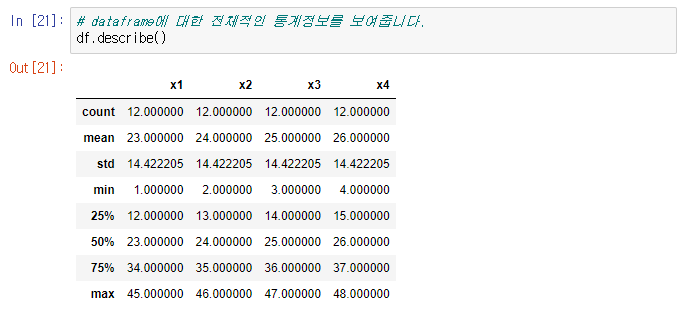 df.describe() 는 DataFrame에 대한 전체적인 통계정보를 보여주게 된다.