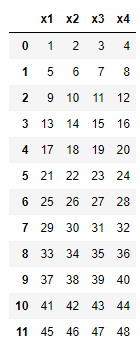 df = pd.DataFrame( data = np.arange(1,49).reshape(12,4) , columns = ["x1","x2","x3","x4"])