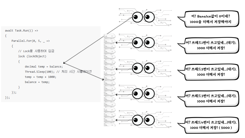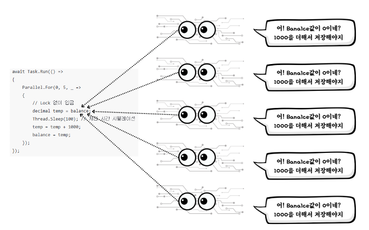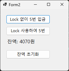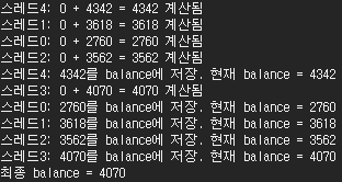 Debug.WriteLine($"스레드{threadId}: {myBalance} + {depositAmount} = {newBalance} 계산됨");