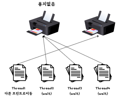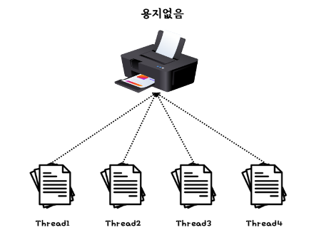 - 여러 스레드(Thread1,2,3,4)가 하나의 프린터로 접근 시도