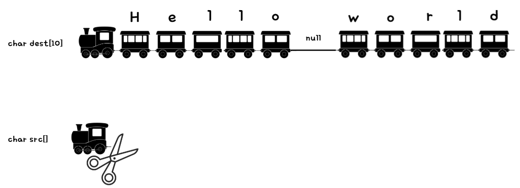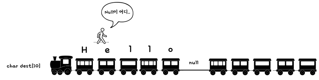 위 이미지 처럼 dest라는 char 배열에서는 H e l l o 이후 null 이라는 빈공간을 발견해야 배열이 끝나는 것을 알 수 있는것이죠.