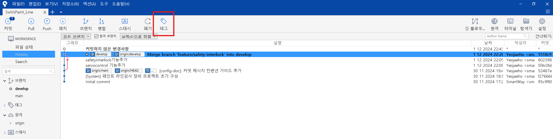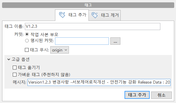 - 태그를 붙일 커밋을 히스토리에서 선택
