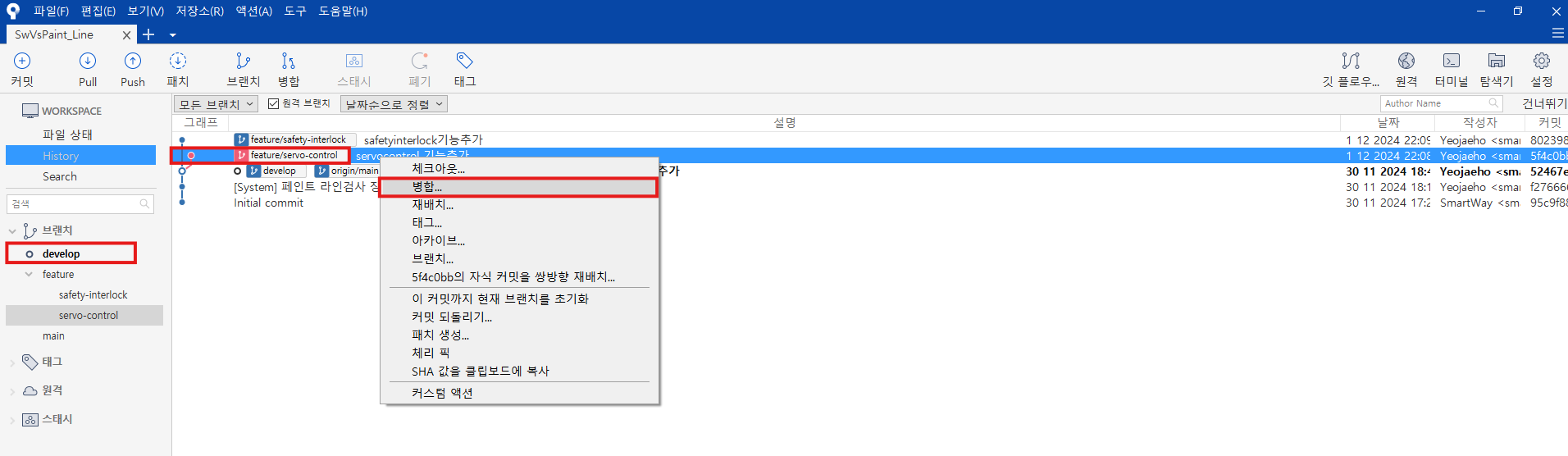- 병합하는 방법은 병합해야할 상위 브랜치를 클릭한 뒤 하위 브랜치를 병합하는 방식으로 진행