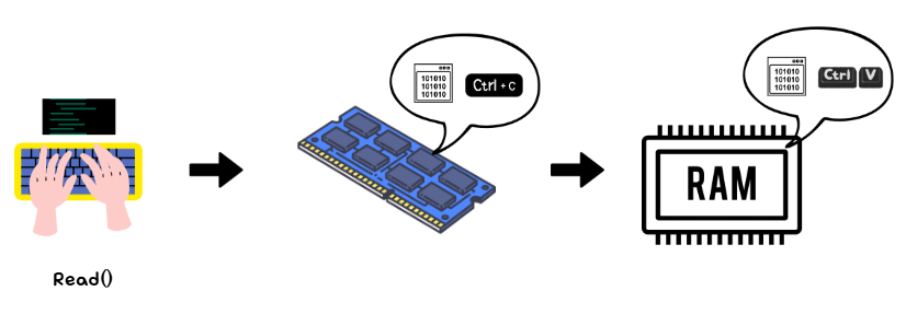 이를 RAM의 특정 영역(버퍼)로 복사한 뒤 프로그램에서 사용가능한 상태로 만드는 것입니다.