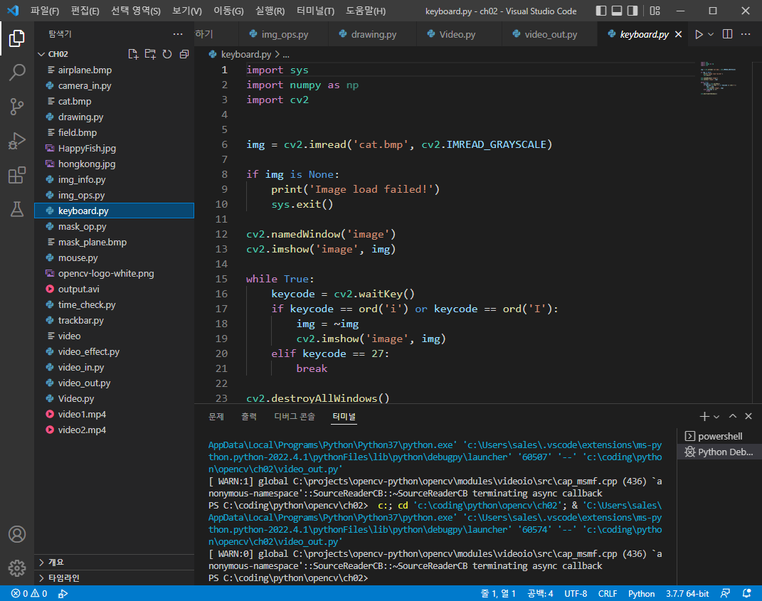아래 예제는 키보드 입력을 통해 영상을 처리하는 코드로 구성되어있다.
