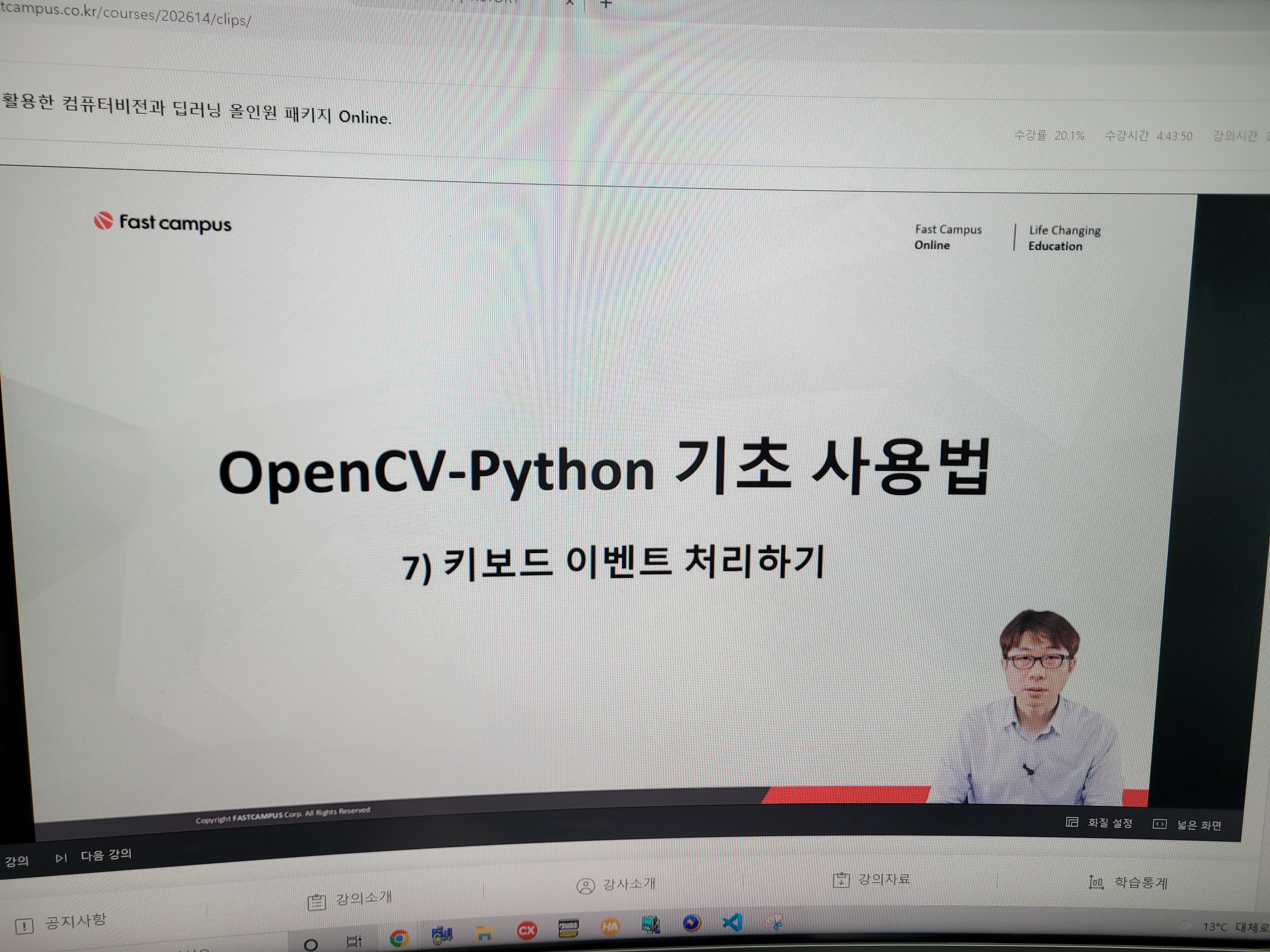 - 키보드 입력 대기함수 ( cv2waitkey(dealy==None) ) 위 함수는 이 전 강의에서도 많이 사용했었는데 키보드의 입력이 들어올때까지 계속해서 기다리는 함수이다. delay = 밀리초 단위 대기 시간. delay가 0보다 작거나 같으면 무한히 기다린다. 디폴트값은 0이다.그리고 키보드의 입력이 들어오면 retval로 반환을 해주는데 눌린 키 값의 ASCII 코드로 반환된다.