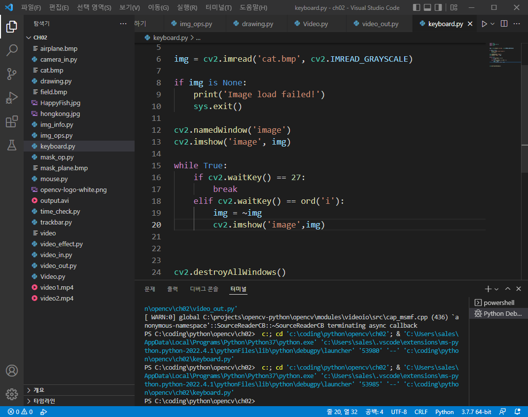 아래 예제는 키보드 입력을 통해 영상을 처리하는 코드로 구성되어있다.