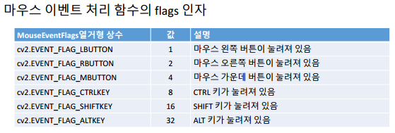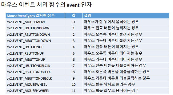 onMouse ( event, x, y, flags, param ) 의 인자를 갖고있다.