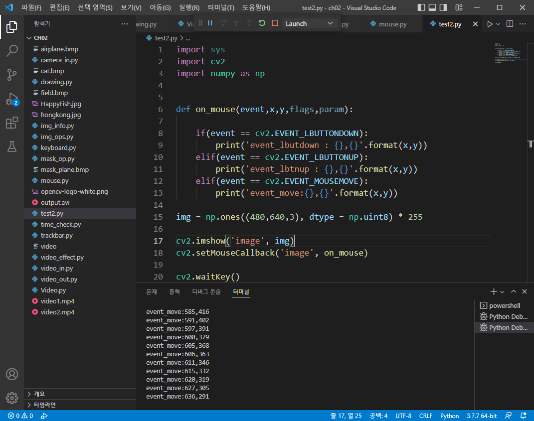 그런데 위와같이 EVENT_MOUSEMOVE 이벤트를 사용하게 되면 마우스를 움직일때마다 print 되게되어 불편함이 있는데