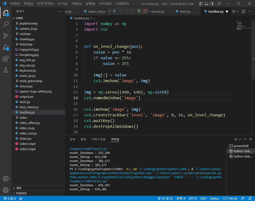 위 코드처럼 level이라는 트랙바를 생성해서 image라는 이미지를 불러온뒤