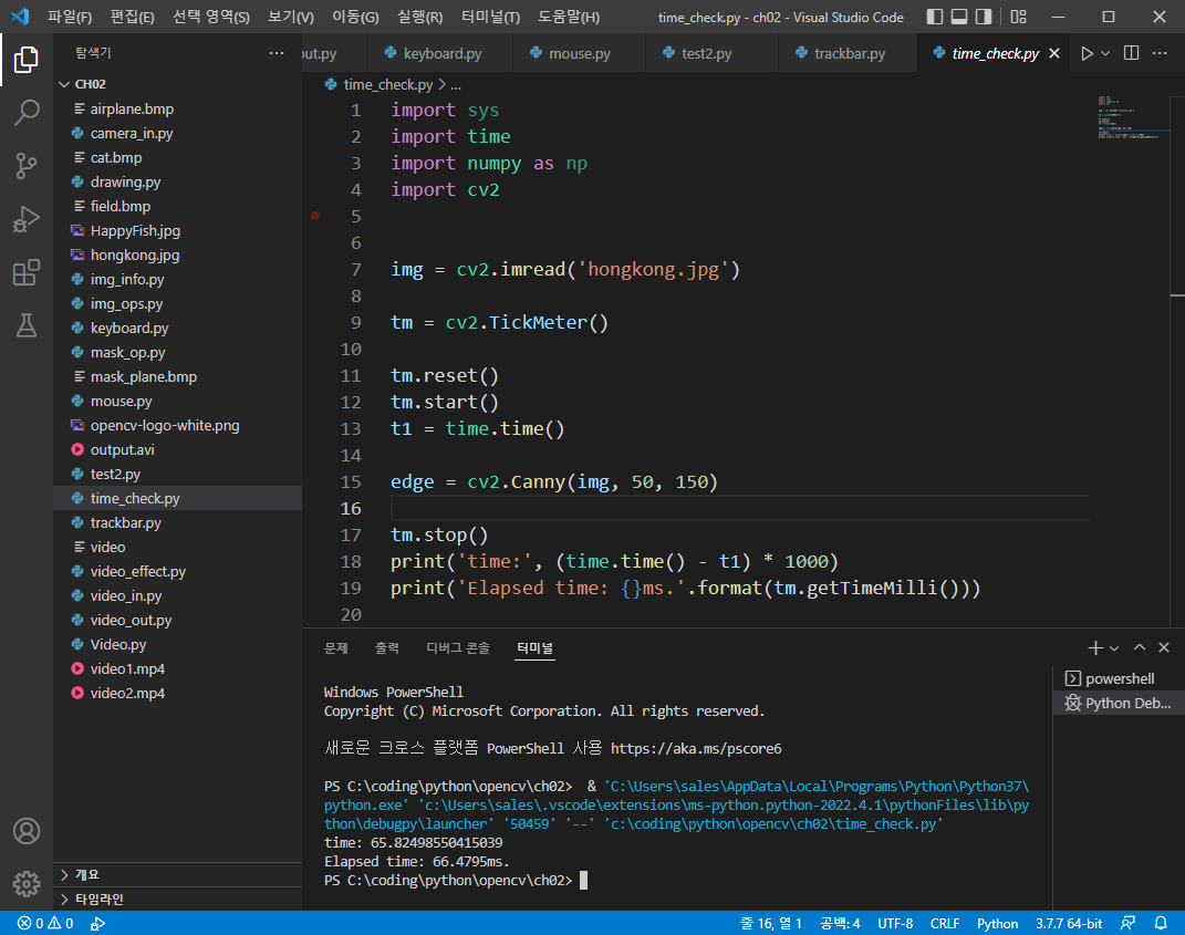 위 코드를 보게되면 hongkong 이라는 jpg 파일을 로드해서 Canny 라는 엣지처리를 해주는 연산 시간을 측정하게