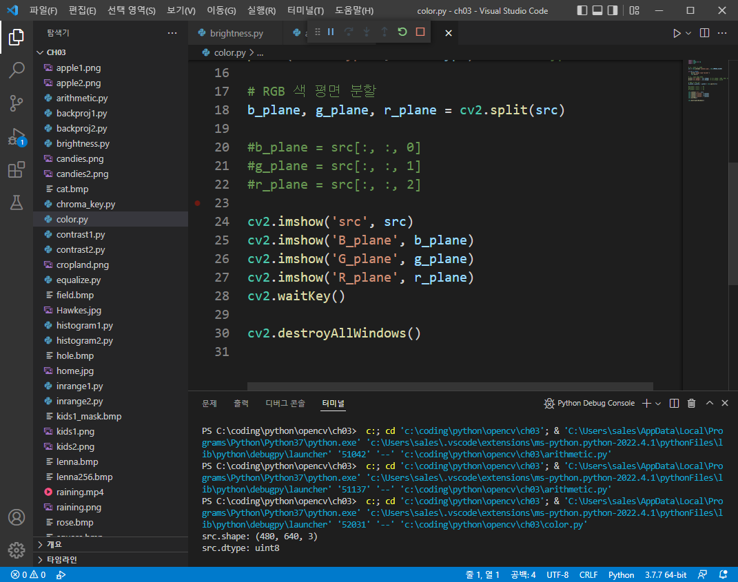 이는 cv2.split 이라는 함수를 사용하여 각각의 원소값을 뗄 수 있다.