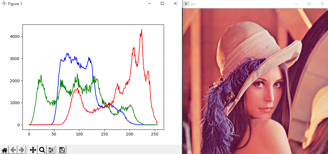 위와같이 컬러영상의 B G R 값을 따로 계산하여 Histrogram 을 계산할 수 있다.