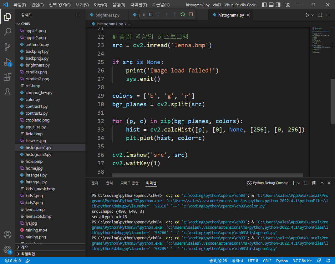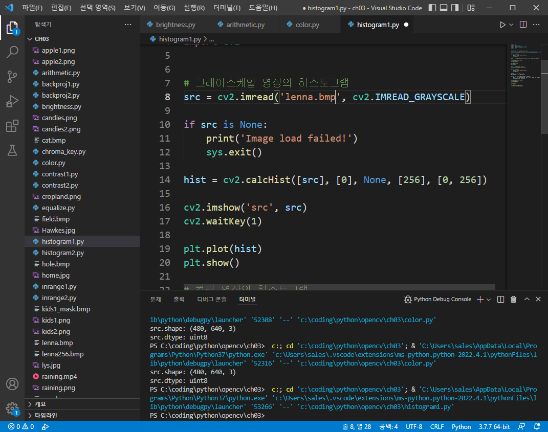 [Open CV] 기본적인 영상처리 기법 _ 히스토그램 평활화 (0) | 2022.05.11 |