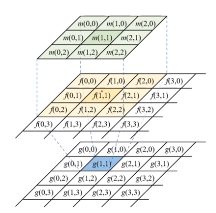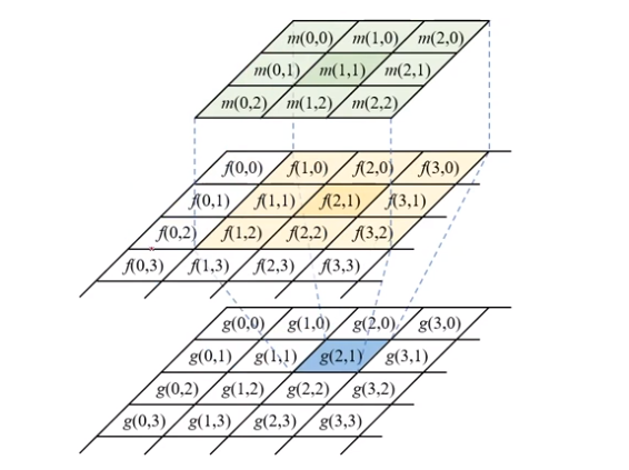 마스크의 행렬의 원소값과 같은 위치에 있는 입력영상 픽셀값을 곱한다.
