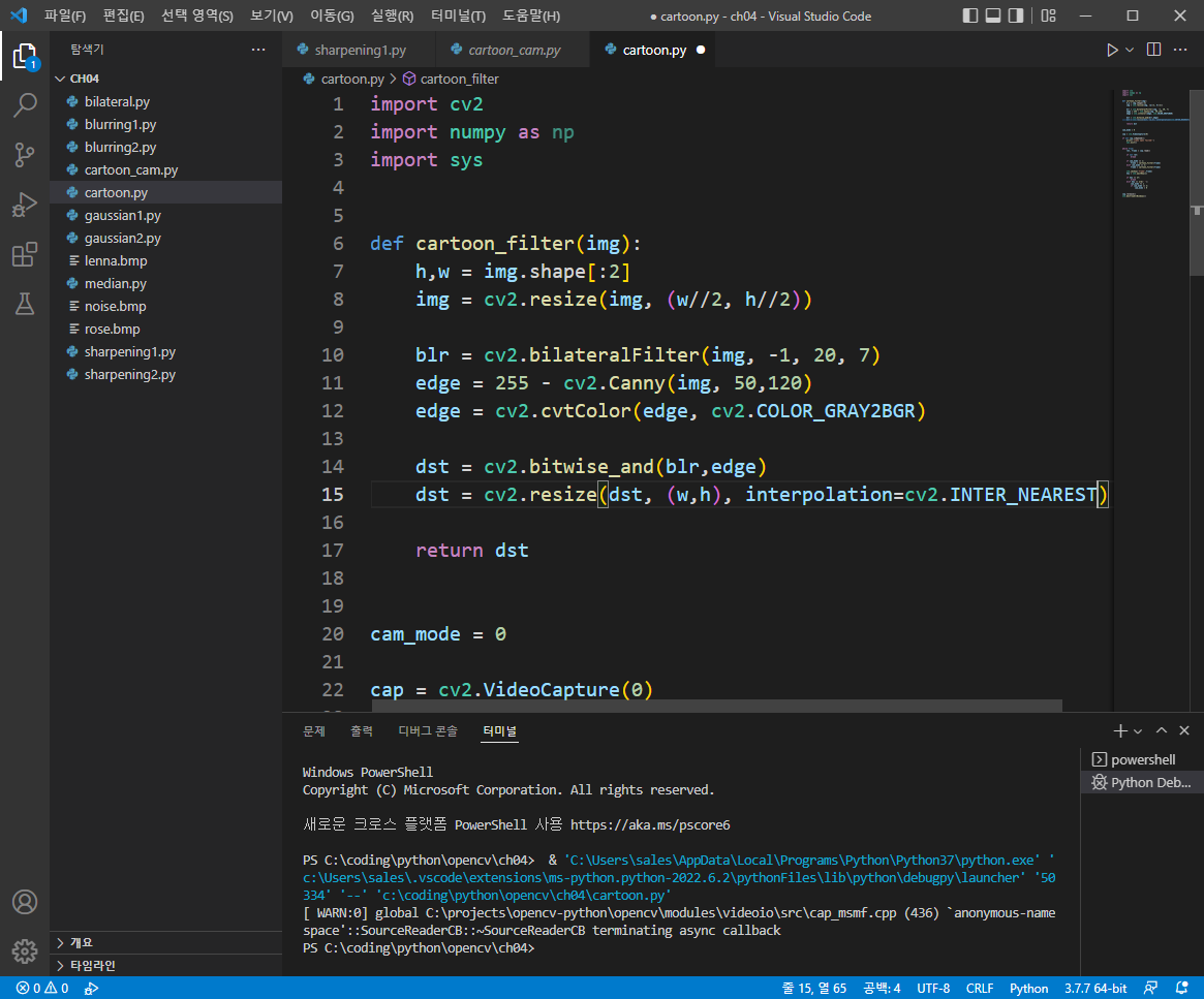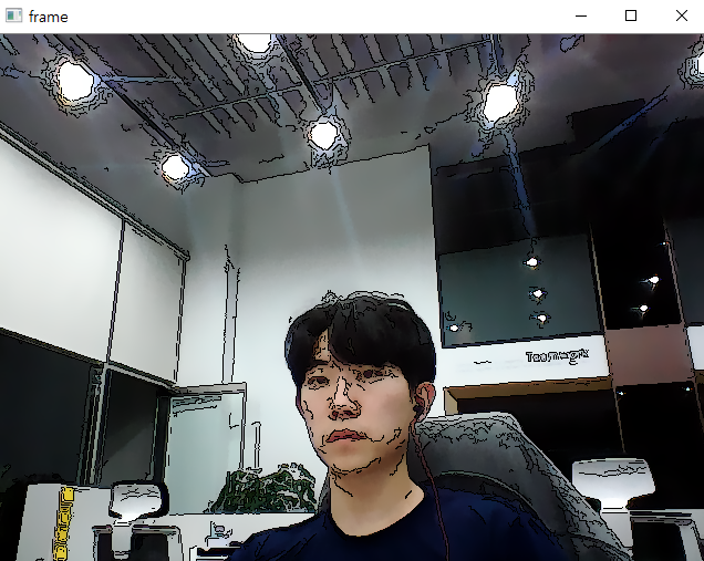 금일은 노트북에 있는 웹캠을 통해 입력되는 영상을 실시간으로 카툰 필터링을 적용하는 기능을