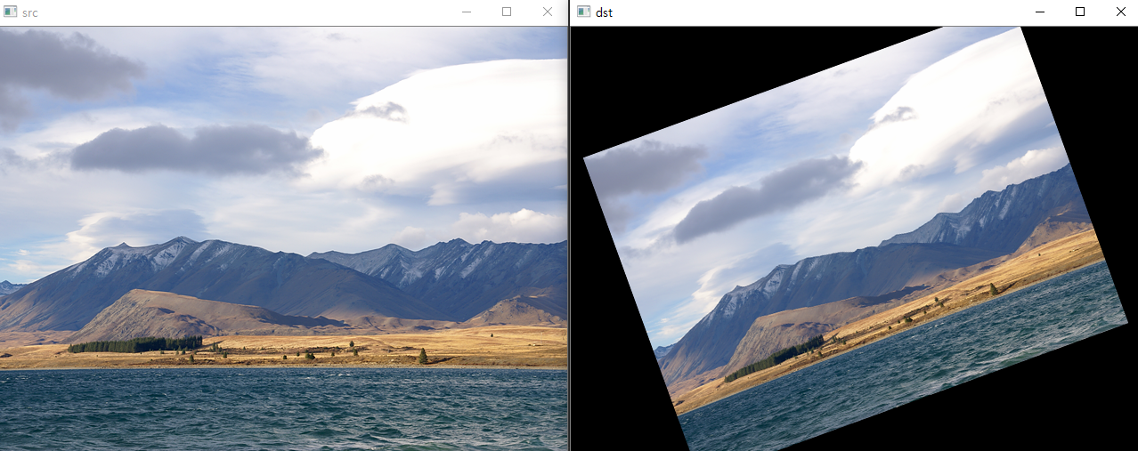 위 영상처럼 입력영상의 중심점을 기준으로 출력영상이 회전되는 것을 볼 수 있다.
