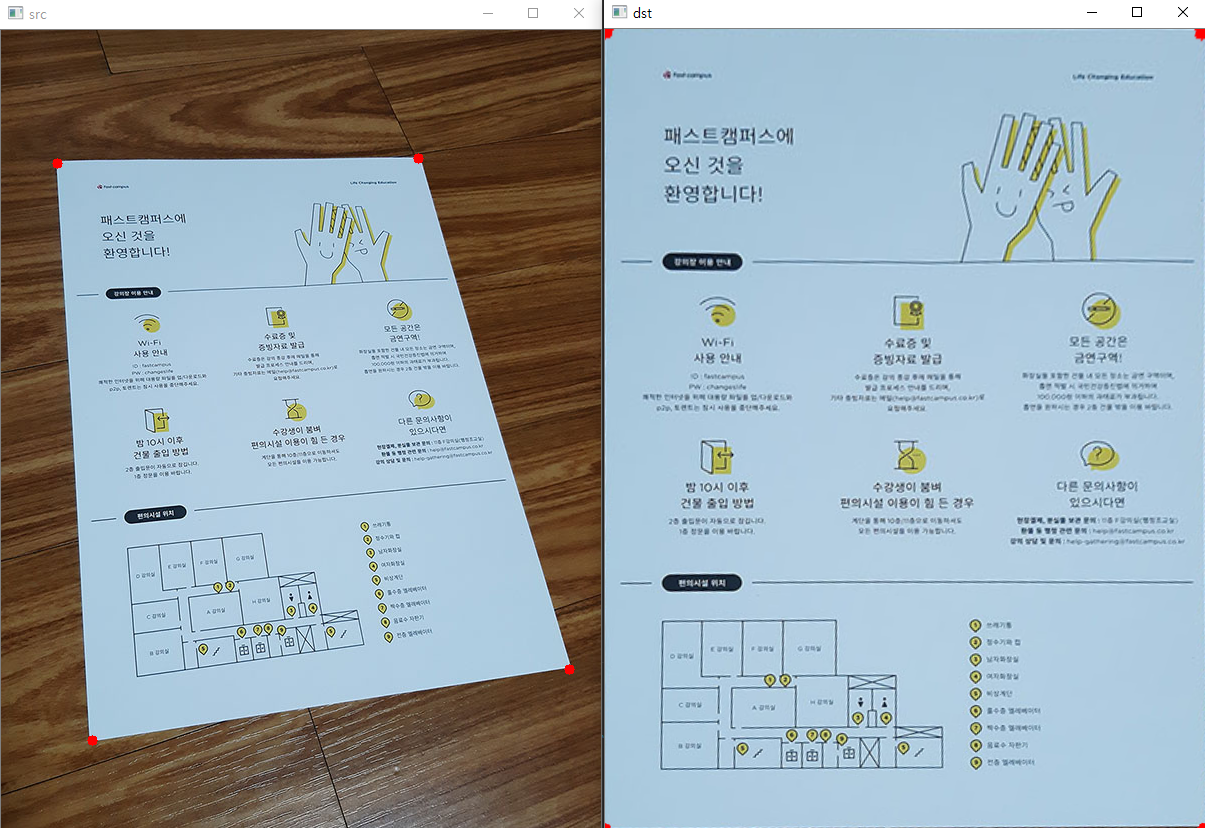 일단 위와같은 기능을 구현하기 전 Open cv C++ 기반으로 만들어 본 투시변환 예제를 사용하여 나름대로의