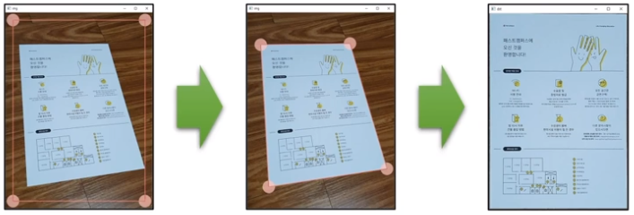 - 카메라로 촬영한 문서 영상을 똑바로 펴서 저장해주는 프로그램 구현
