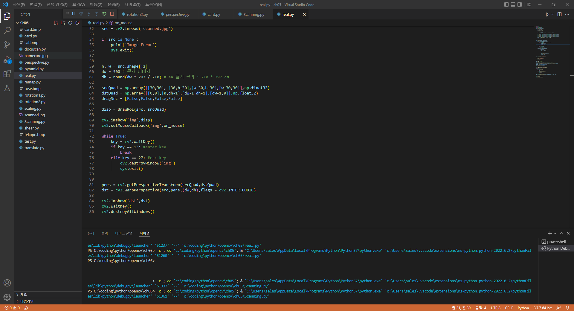 - 왜곡된 문서 영상을 직사각형 형태로 똑바로 펴기 ( 투시변환 ( Perspective ) )