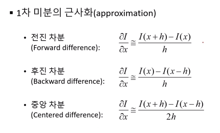 현재 영상에서 가장 정확한 미분값을 구하는 방법으로는 중앙차분이 많이 사용되고 있다.