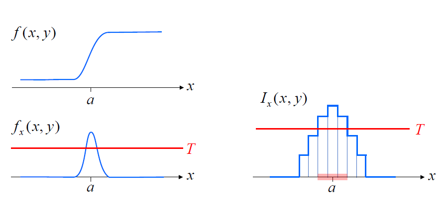 ( 값이 가장 급격히 바뀌는 부분은 피크치를 갖는다. )그리고 T 값이 의미하는 것은 정해놓은 Threshold 값인데 미리 설정해 놓은 Threshold 값을 넘는 부분을 영상에서의 엣지라고 판단할 수 있다.