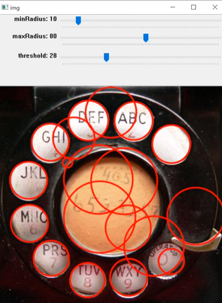 cv2.HoughCircles ( image, method, dp, minDist, circles, param1, param2, minRadius, maxRadius )