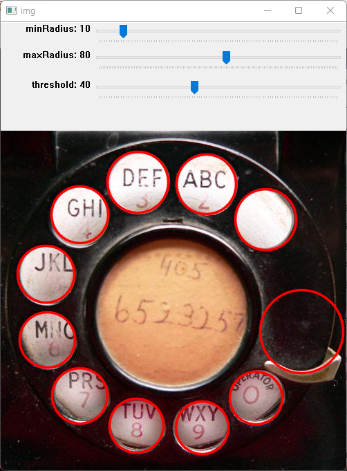 minRadius, maxRadius : 검출할 원의 최소, 최대 반지름