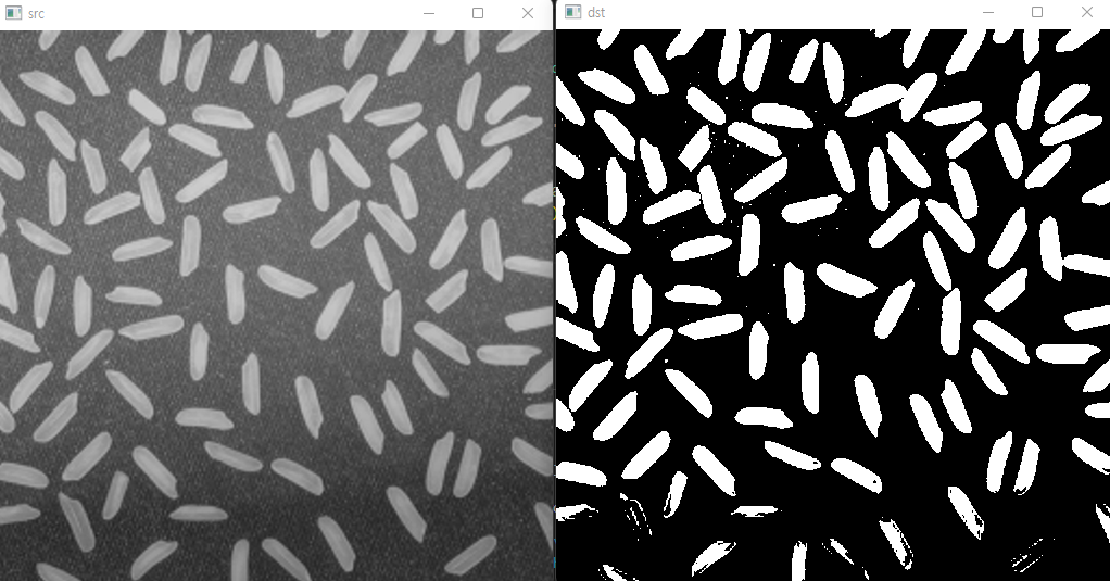 위와 같이 Otsu 알고리즘을 적용시켜도 하단 부분에 쌀알이 제대로 표현되지 않은 것을 볼 수 있다.