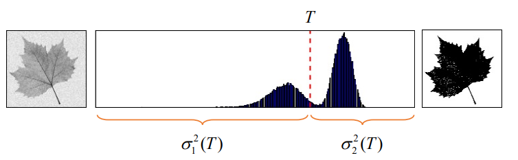- 임의의 임계값 T에 의해 나눠지는 두 픽셀 분포 그룹의 분산이 최소화되는 T를 선택